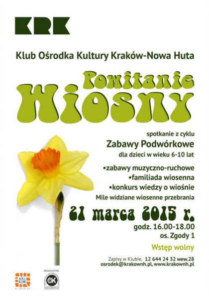 | Klub Orodka Kultury Krakw-Nowa Huta (os. Zgody 1) zaprasza na spotkanie z cyklu Zabawy podwrkowe, ktrego celem jest wsplne mie spdzenie wolnego czasu w sobotnie popoudnie, ksztatowanie wraliwoci estetycznej, poczucia pikna przyrody oraz zaangaowanie dzieci do udziau w konkursach i zabawach muzyczno-ruchowych zwizanych z nadchodzc wiosn. 21 marca dzieci wezm udzia w konkursie plastycznym, odpowiedz na pytania w konkursie doty(...) ... więcej » |