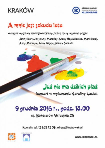 | W zimowy pitkowy wieczr na przekr niegom, mrozom i przedwitecznym porzdkom Klub Mirage Orodka Kultury Krakw-Nowa Huta zaprasza na wernisa wystawy malarstwa Janiny Korty, Krystyny Morady, Sawy Hajdukiewicz, Marii Rataj, Anna Marczyk, Anny Gajdy, Jolanty Surwki pt. A mnie jest szkoda lata. Autorkami prac s kobiety, ktre mwi o sobie Grupa, ktr czy wsplna pasja. To ju kolejny projekt realizowany w Klubie z udziaem artystek. Ty(...) ... więcej » |