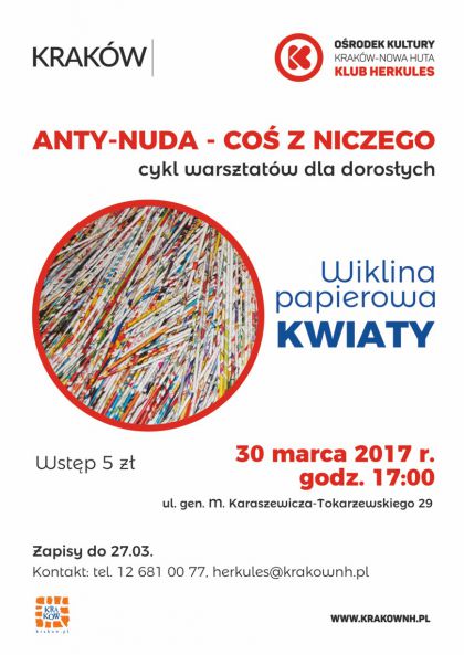 | Klub Herkules Orodka Kultury Krakw-Nowa Huta (ul. Gen. M. Karaszewicza-Tokarzewskiego 29) zaprasza na kolejne warsztaty dla dorosych z cyklu Anty-nuda, ktre odbd si 30.03. o godz. 17.00. Pozostajc w temacie wikliny papierowej, organizatorzy naucz uczestnikw jak wykona kolejn ozdob z uyciem tego atwo dostpnego materiau. W czasie warsztatw nowi uczestnicy naucz si jak przygotowa papierow wiklin oraz jak krok po kroku wykona (...) ... więcej » |
