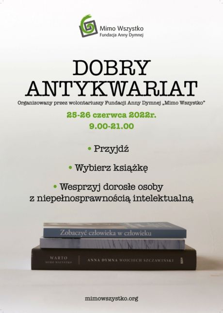 Czy nadanie ksikom drugiego ycia moe pomc potrzebujcym? Okazuje si, e tak, o czym bdzie mona przekona si ju w najbliszy weekend w Galerii Bronowice. 25 i 26 czerwca pojawi si tu Dobry Antykwariat zorganizowany przez wolontariuszy Biura Modych Fundacji Anny Dymnej Mimo Wszystko. Bd warsztaty kaligrafii, tworzenia kartek, zakadek do ksiek, komiksw, bajkoterapii, spotkanie autorskie i... moc ksiek.