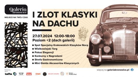 I Zlot Klasyki odbędzie się 27 lipca, w godz. 12:00-18:00, na dachu Galerii Bronowice (na dach prowadzą schody ruchome na poziomie +1 przy lokalu Media Markt). Wydarzenie powstało we współpracy z Krakowskimi Klasykami Nocą oraz kantyna.