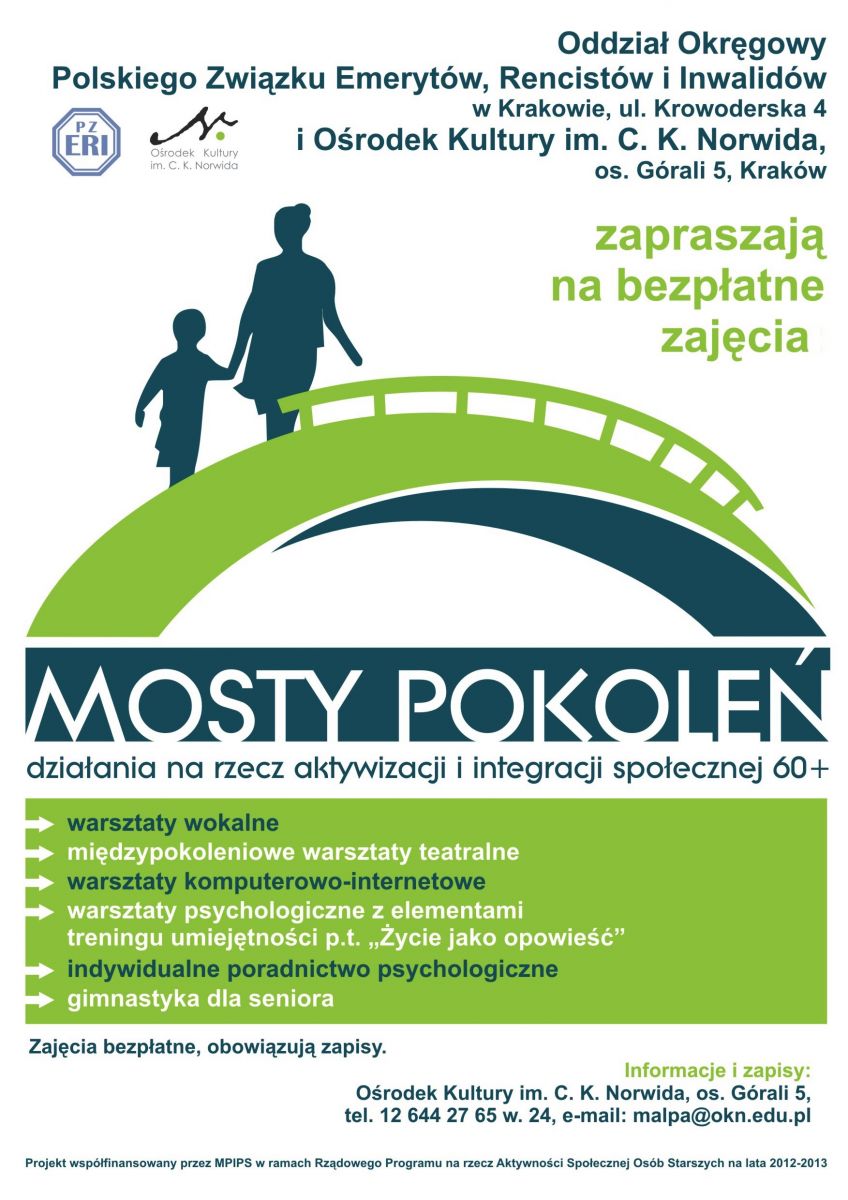 Oœrodek Kultury im. C. K. Norwida oraz Polski Zwišzek Emerytów, Rencistów i Inwalidów - Oddział Okręgowy w Krakowie zapraszajš seniorów (60+) do aktywnego udziału w zajęciach w ramach nowego projektu „Mosty pokoleń”. Projekt realizowany będzie do czerwca 2013 w Krakowie. W ramach projektu przygotowano m.in. warsztaty wokalne, psychologiczne, międzypokoleniowe warsztaty teatralne. Udział w zajęciach jest bezpłatny.