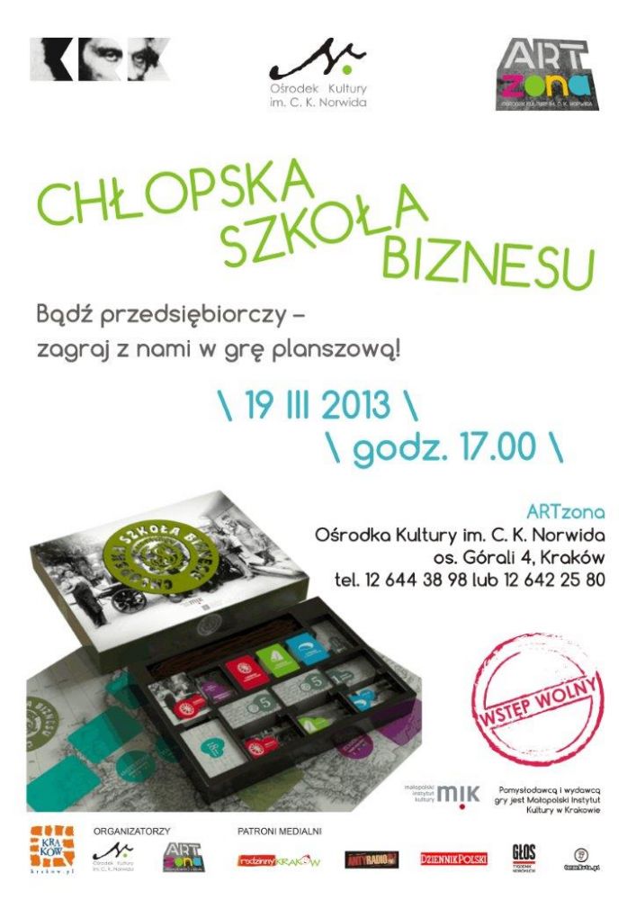 Serdecznie zapraszamy do ARTzony Orodka Kultury im. C. K. Norwida na Chłopskš Szkołę Biznesu planszowš grę integracyjnš z udziałem mieszkańców Nowej Huty.