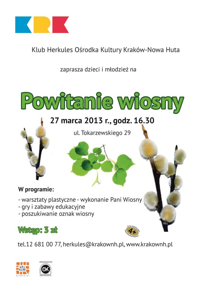 Zima powoli dobiega końca i z tej okazji Klub Herkules Oœrodka Kultury Kraków-Nowa Huta(ul. Gen. M. Karaszewicza-Tokarzewskiego 29) zaprasza dzieci i młodzież do wspólnego œwiętowania.