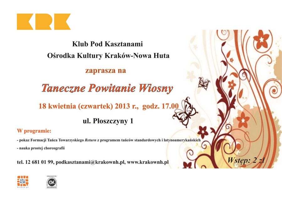 W osiedlu Koœcielniki tradycjš już stało się witanie wiosny w tanecznych rytmach. W programie imprezy organizowanej przez Klub Pod Kasztanami Oœrodka Kultury Kraków-Nowa Huta (ul. Płoszczyny 1) znajdzie się zatem pokaz tańców standardowych i latynoamerykańskich w wykonaniu Formacji Tańca Towarzyskiego Return. Uczestnicy imprezy będš mieli też okazję nauczyć się prostej choreografii.