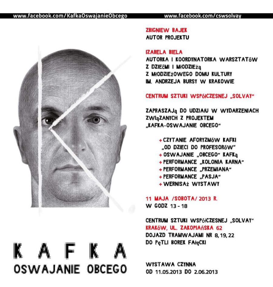 Już 11 maja w Centrum Sztuki Współczesnej niezwykle ciekawe spotkanie ze sztukš. KAFKA-OSWAJANIE OBCEGO to projekt artystyczny, którego autorem jest prof. Zbigniew Bajka. Celem projektu jest przedstawienie twórczoœci Franza Kafki, w szerzymy aspekcie w ramach innych niż literatura dziedzin sztuki oraz spojrzenie na siebie przez pryzmat twórczoœci artysty. W programie imprezy przewidziano m.in.: