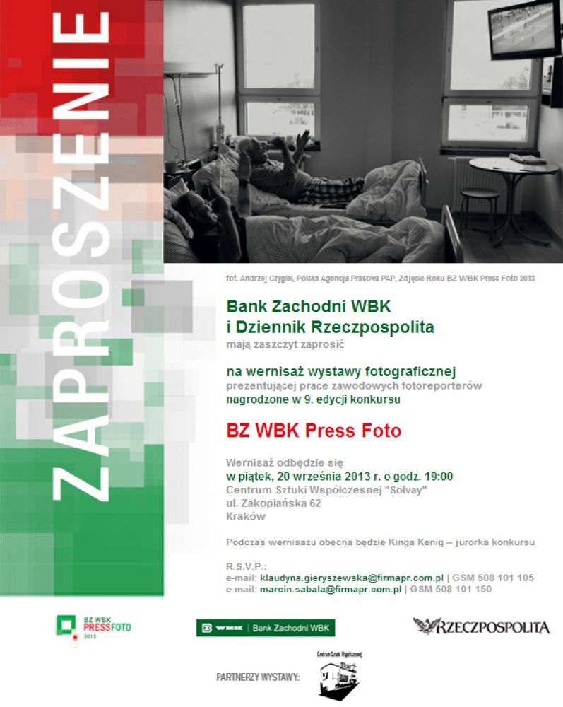 Już 20 wrzenia w Centrum Sztuki Współczesnej Solvay w Krakowie zagoszczš zdjęcia autorstwa czołowych polskich fotografów prasowych, dokumentujšcych najważniejsze wydarzenia 2012 roku. Wród nich znalazły się fotografie i fotokasty znanych krakowskich i zakopiańskich fotografów: Bartłomieja Jureckiego (Tygodnik Podhalański), Jakuba Ociepy (Gazeta Wyborcza Kraków) oraz Bartka Solika (freelancer).