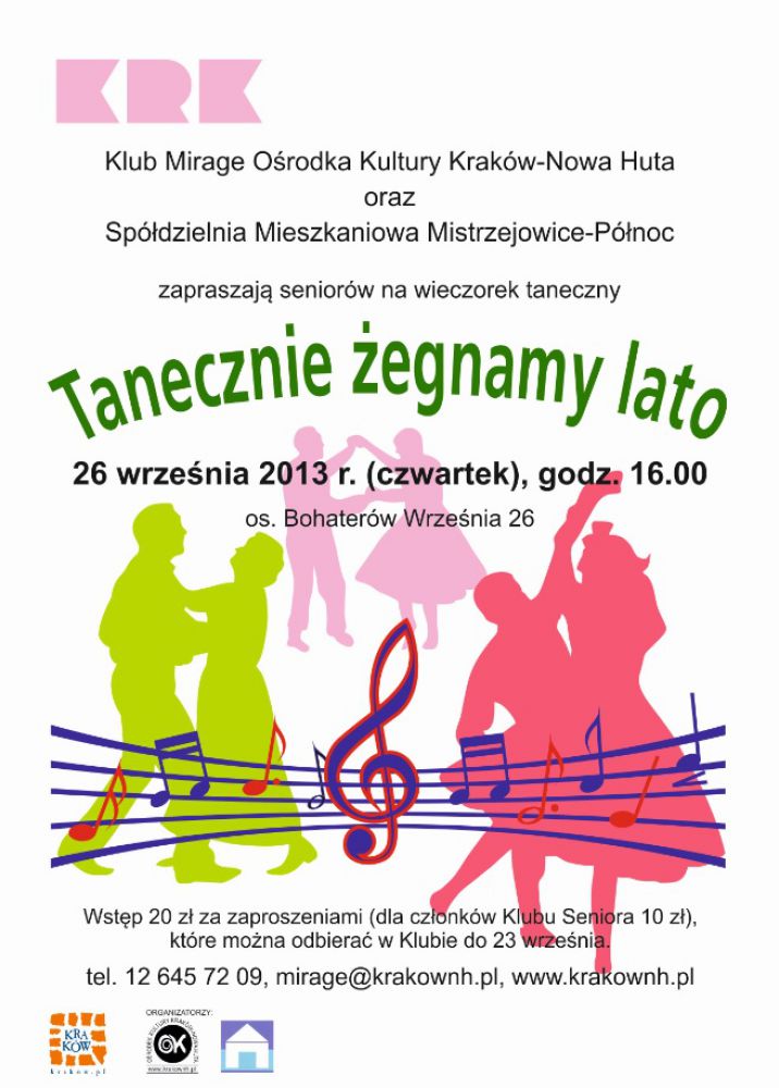Klub Mirage Oœrodka Kultury Kraków-Nowa Huta (os. Bohaterów Wrzeœnia 26) zaprasza na wieczorek taneczny dla seniorów, który odbędzie się 26 wrzeœnia o godz. 16.00. Do tańca zagra zespół Szwajca Band. Dla goœci przewidziano słodki poczęstunek oraz napoje. Współorganizatorem imprezy jest Spółdzielnia Mieszkaniowa Mistrzejowice-Północ.