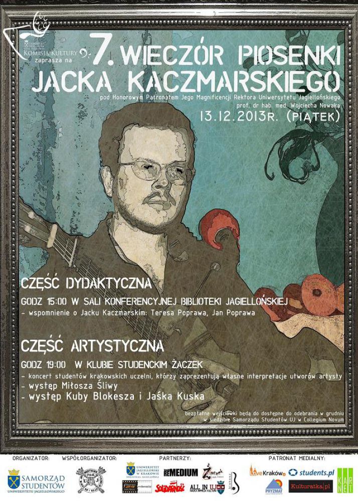 Spotkanie z poezjš i muzykš Jacka Kaczmarskiego rozpocznie się o godz. 19 w Klubie Studenckim „Żaczek”. Motywem przewodnim tegorocznego Wieczoru Piosenki Jacka Kaczmarskiego będš utwory artysty inspirowane obrazami m. in. Hieronima Boscha, Rembrandta, Francisco Goi, czy Witkacego w wykonaniu studentów krakowskich uczelni. Podczas koncertu usłyszymy przede wszystkim kompozycje z albumu „Muzeum” z 1981 roku, ale program obejmuje też repertuar z innych płyt artysty.
