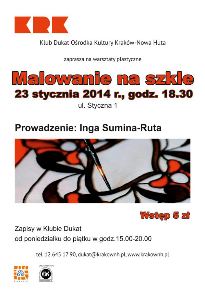 Klub Dukat Orodka Kultury Kraków-Nowa Huta (ul. Styczna 1) zaprasza na warsztaty plastyczne powięcone technikom malowania na szkle. Zajęcia odbędš się 23 stycznia o godz. 18.30.
