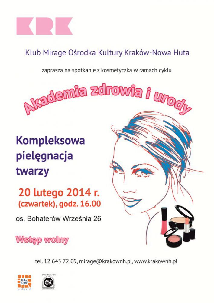 Kolejne spotkanie dla Pań z konsultantkami kosmetycznymi w ramach cyklu Akademia Zdrowia i Urody, organizowanego przez Klub Mirage Oœrodka Kultury Kraków-Nowa Huta. Tym razem uczestniczki spotkania dowiedzš się, jakie zabiegi należy stosować w codziennej pielęgnacji, aby zachować piękny i zdrowy wyglšd skóry. Ponadto przewidziano prezentację zabiegów na twarz, a także porady indywidualne oraz kiermasz kosmetyków.