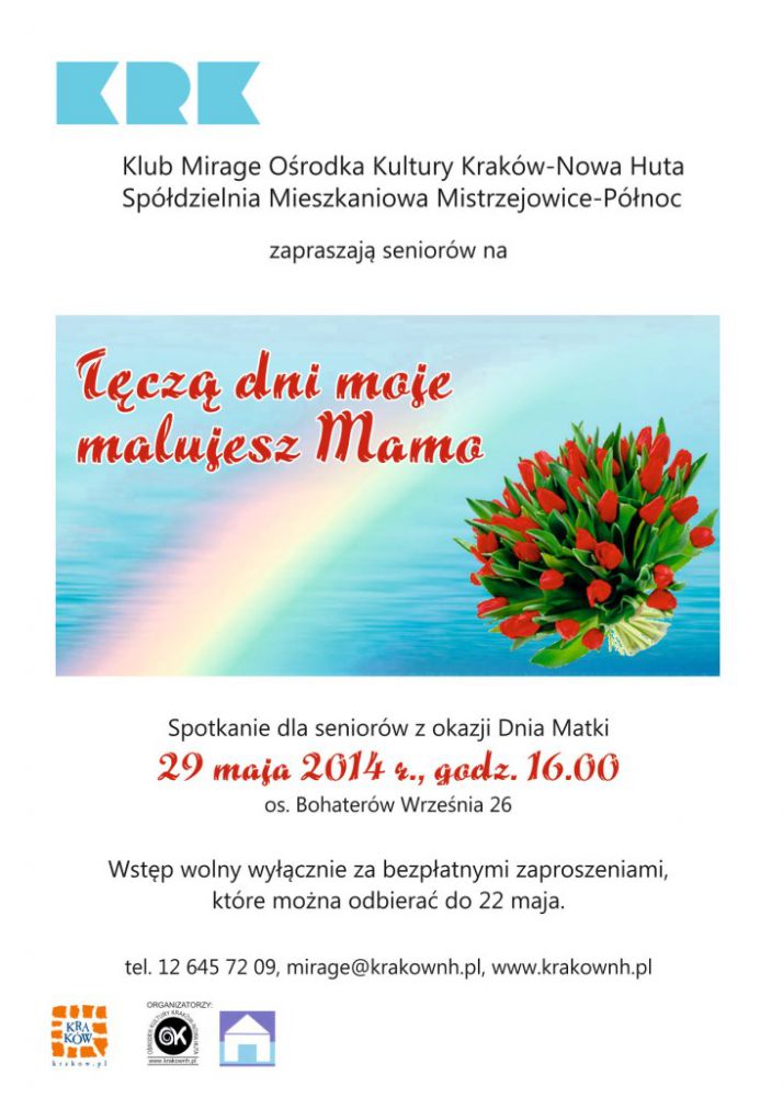 Klub Mirage Orodka Kultury Kraków-Nowa Huta (os. Bohaterów Wrzenia 26) tradycyjnie od wielu lat w maju organizuje uroczyste spotkanie dla seniorów, wpisujšce się w kalendarz obchodów Dnia Matki. Również i w tym roku 29 maja o godz. 16.00 będš życzenia i słodkoci. W okolicznociowym programie wystšpiš dzieci z Przedszkola Samorzšdowego nr 177.