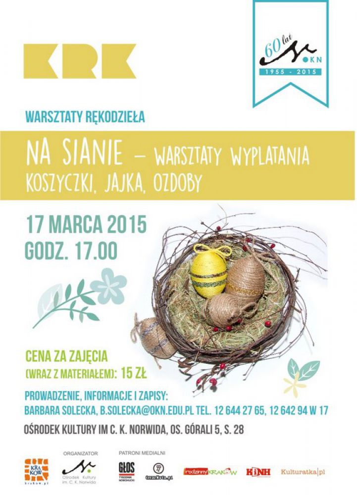 Serdecznie zapraszamy na warsztaty rękodzieła, na których wykonamy m.in. sznurkowe pisanki oraz samodzielnie upleciemy koszyczek z siana. Cena za zajęcia wraz z materiałem 15 zł. Informacja i zapisy Barbara Solecka b.solecka@okn.edu.pl tel 12 644 27 65, w. 17.
