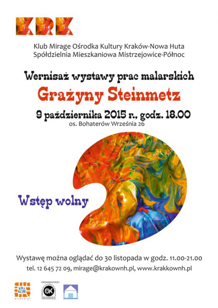 Klub Mirage Orodka Kultury Kraków-Nowa Huta (os. Bohaterów Wrzenia 26) zaprasza 9 padziernika o godz. 18.00 na wernisaż obrazów Grażyny Stenimetz.