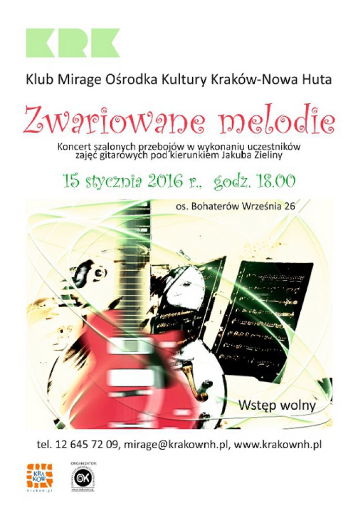 Uczestnicy zajęć gitarowych w Klubie Mirage Oœrodka Kultury Kraków-Nowa Huta pod kierunkiem Pana Jakuba Zieliny przygotowali koncert szalonych utworów, którymi planujš zachwycić nawet najbardziej wymagajšcš publicznoœć. Serdecznie zapraszamy do Klubu Mirage (os. Bohaterów Wrzeœnia 26) 15 stycznia na godz. 18.00. Co może być bardziej budujšcego od dziecięcej radoœci płynšcej z tworzonej i wykonywanej muzyki? PrzyjdŸcie i przekonajcie się sami.
