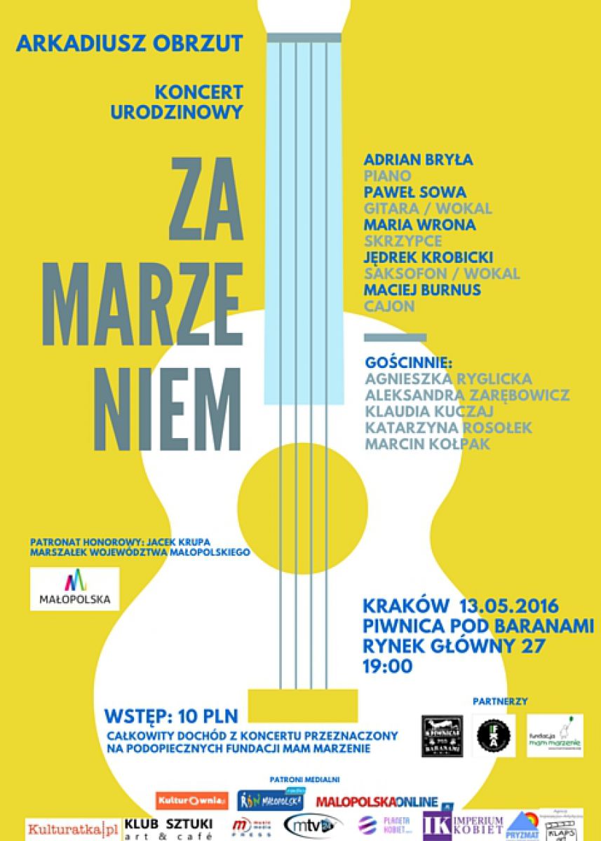 13 maja o godzinie 19:00 w Piwnicy Pod Baranami pod Honorowym Patronatem Jacka Krupy Marszałka Województwa Małopolskiego odbędzie się koncert urodzinowy Za marzeniem aktora-wokalisty Arkadiusza Obrzuta!
