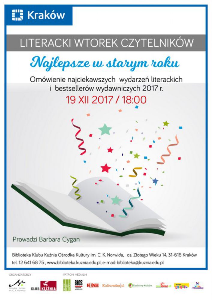 W 2017 roku pojawiło się wiele ciekawych debiutów literackich, nie zawiedli również pisarze mainstreamowi. Wydawnictwa trzymały poziom "wypuszczajšc" najgłoniejszych autorów z zagranicy oraz nadšżajšc z najbardziej aktualnymi tematami współczesnoci. Co warto przeczytać, o czym warto wiedzieć? Zapraszamy na Wtorek Literacki podsumowujšcy mijajšcy rok. Spotkanie prowadzi Barbara Cygan z Biblioteki Klubu Kunia.