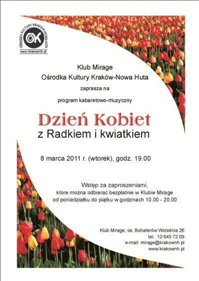 Na wieczór kabaretowy dla pań z okazji Dnia Kobiet zaprasza Klub Mirage Oœrodka Kultury Kraków-Nowa Huta. W programie: recital piosenek o miłoœci w wykonaniu Radosława Omiecińskiego oraz karaoke. Przybyłe panie otrzymajš kwiaty i drobny upominek.