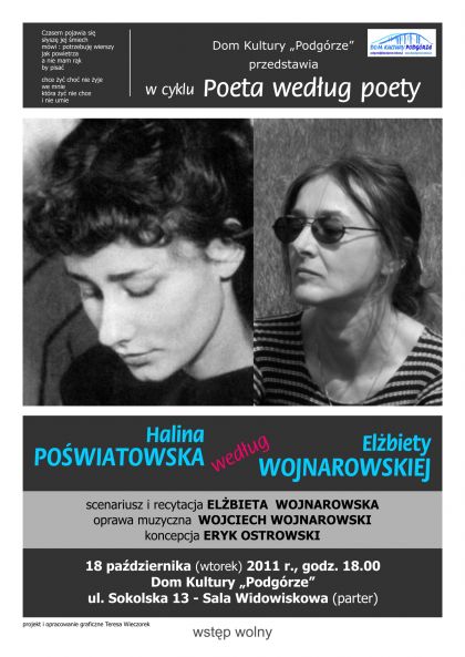Jej twórczoć przypomni Elżbieta Wojnarowska, poetka,scenarzystka, autorka znanych i cenionych powieci ("Anemony", "Wygnańcy raju", "Niekochani", "Pod bezkresnym niebem").