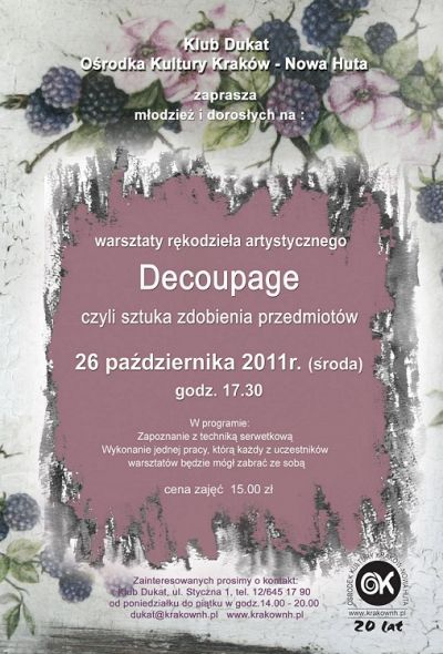 Zajęcia odbędš się 26 padziernika (roda) 2011 r. w godz. 17.30 19.00 i powięcone będš technice decoupage - czyli sztuce zdobienia przedmiotów.