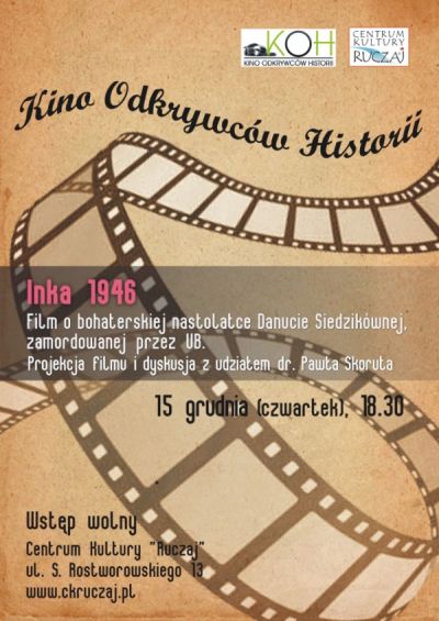 W najbliższy czwartek 15 grudnia o godz. 18:30 zapraszamy do Centrum Kultury "Ruczaj" (ul. Rostworowskiego 13) na kolejne spotkanie z cyklu Kino Odkrywców Historii. Tym razem zostanie zaprezentowany film "Inka 1946", który opowiada historię niespełna 18-letniej Danuty Siedzikówny, sanitariuszki i łšczniczki w V Brygadzie Wileńskiej AK, mjr Zygmunta Szendzielorza "Łupaszki", skazanej za mordowanie rannych jeńców z UB - ludzi, którym w rzeczywistoci ratowała życie.