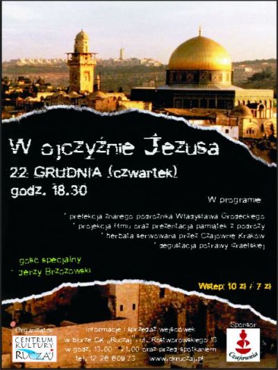 W czwartek, 22 grudnia o godz. 18:30 zapraszamy do Centrum Kultury "Ruczaj" na spotkanie Klubu Podróżnika. Temat najbliższego spotkania to "W ojczyŸnie Jezusa", a poprowadzi je Władysław Grodecki, który zaprezentuje filmy, zdjęcia i pamištki ze swojej podróży do Izraela. Goœciem specjalnym będzie Jerzy Brzozowski. Dodatkowo, wszyscy uczestnicy będš mogli spróbować tradycyjnej, izraelskiej potrawy oraz herbaty serwowanej przez Czajownię Kraków.