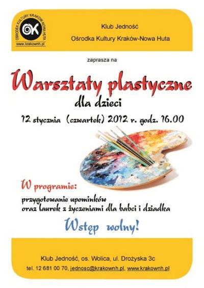 Klub Jedno Orodka Kultury Krakw-Nowa Huta zaprasza na warsztaty, podczas ktrych dzieci bd samodzielnie przygotowywa upominki oraz laurki z yczeniami dla swoich bab i dziadkw.