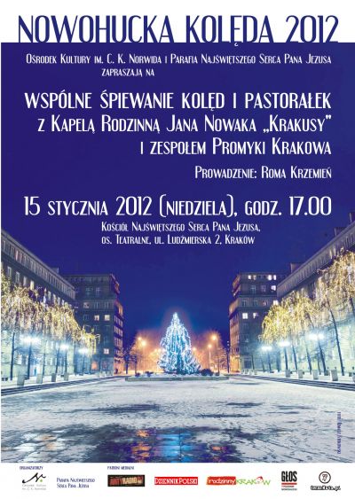 Oœrodek Kultury im. C. K. Norwida serdecznie zaprasza na tradycyjne, coroczne, wspólne kolędowanie z Kapelš Rodzinnš Krakusy i Promykami Krakowa do Koœcioła pw. Najœwiętszego Serca Pana Jezusa. Spotkanie poprowadzi Roma Krzemień, wstęp wolny.