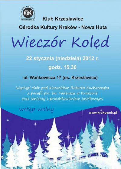 Klub Krzesławice Oœrodka Kultury Kraków-Nowa Huta (ul. Wańkowicza 17) zaprasza na występ Chóru Kameralnego z programem kolęd.