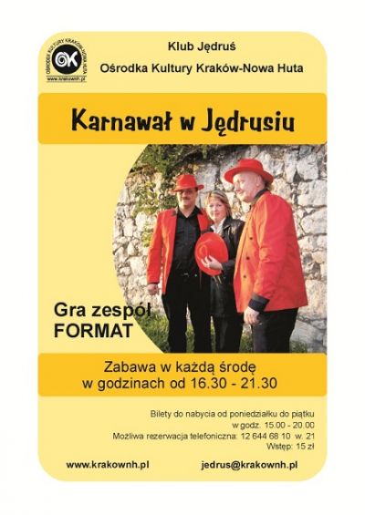 Zapraszamy dorosłych i seniorów do Klubu Jędruœ Oœrodka Kultury Kraków-Nowa Huta na karnawałowe zabawy taneczne przy muzyce na żywo w wykonaniu zespołu Format. W cenie biletu kawa lub herbata.