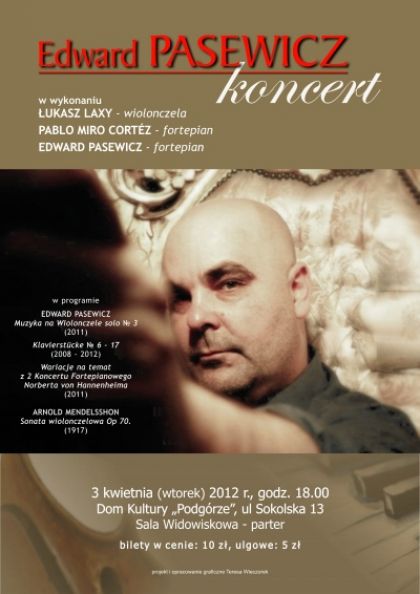 Na koncercie organizowanym przez Dom Kultury Podgórze Edward Pasewicz zaprezentuje swoje nowe kompozycje: Muzyka na Wiolonczelę solo № 3 (2011), Klavierstücke № 6 17 ( 2008 2012) i Wariacje na temat z 2 Koncertu Fortepianowego Norberta von Hannenheima ( 2011) , a także Sonatę wiolonczelowš Op 70. (1917) Arnolda Mendelssohna