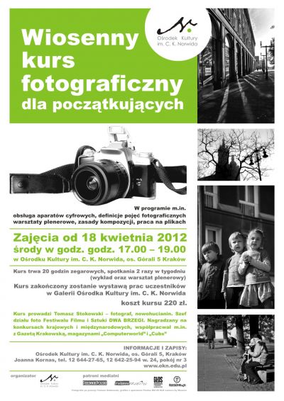 Zapraszamy na kurs fotografii dla poczštkujšcych. Proponujemy różnorodny program zajęć, uczestnicy kursu zapoznajš się m.in. z podstawami obsługi aparatu cyfrowego, zasadami kompozycji oraz podstawami obróbki zdjęć na komputerze. Będš mieli możliwoœć przyswojenia wiedzy na temat fotografii architektury i krajobrazu, fotografii portretowej i reportażu. Dla uczestników zaplanowano poza zajęciami teoretycznymi możliwoœć wykorzystania tejże wiedzy w plenerze. Po zakończeniu kursu organizatorzy zaplanowali wystawę prac uczestników. Warsztaty poprowadzi fotograf i nowohucianin – Tomasz Stokowski, szef działu foto Festiwalu Filmu i Sztuki DWA BRZEGI.