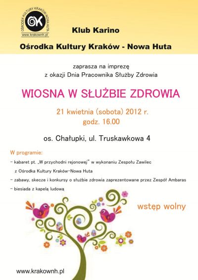 Klub Karino Oœrodka Kultury Kraków-Nowa Huta (ul. Truskawkowa 4) zaprasza mieszkańców Chałupek na imprezę z okazji Dnia Pracownika Służby Zdrowia, która odbędzie się 21 kwietnia 2012 r. (sobota) o godz. 16.00.