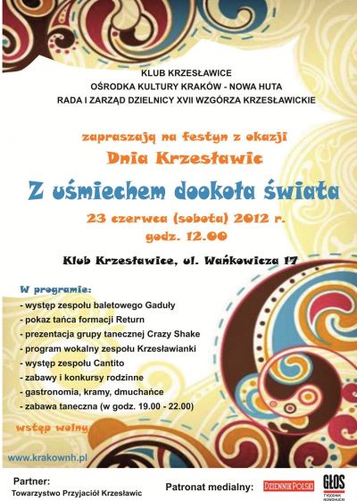Już 23 czerwca br. w jednodniowš podróż dookoła œwiata mieszkańców Krakowa zaproszš: Klub Krzesławice Oœrodka Kultury Kraków-Nowa Huta oraz Rada Dzielnicy XVII Wzgórza Krzesławickie. Przy ul. M. Wańkowicza w godzinach 12.00-23.00 odbędzie się kolejna edycja Dnia Krzesławic, tym razem pod hasłem Z uœmiechem dookoła œwiata.