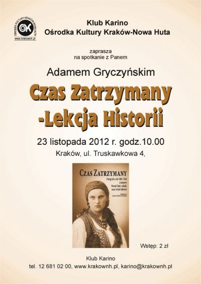 Zapraszamy dzieci i modzie do Klubu Karino Orodka Kultury Krakw-Nowa Huta na spotkanie z Adamem Gryczyskim autorem ksiki Czas zatrzymany. Fotografie z lat 1883-1963 z terenw Nowej Huty i okolic oraz wybr tekstw, za ktr otrzyma Nagrod Krakowska Ksika Miesica. Wykad poczony bdzie z prezentacj zdj.