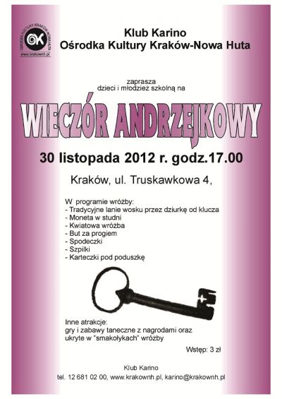 Klub Karino Orodka Kultury Kraków-Nowa Huta (ul. Truskawkowa 4) zaprasza 30 listopada 2012 r. w godz. 17.00-19.00 na andrzejki.